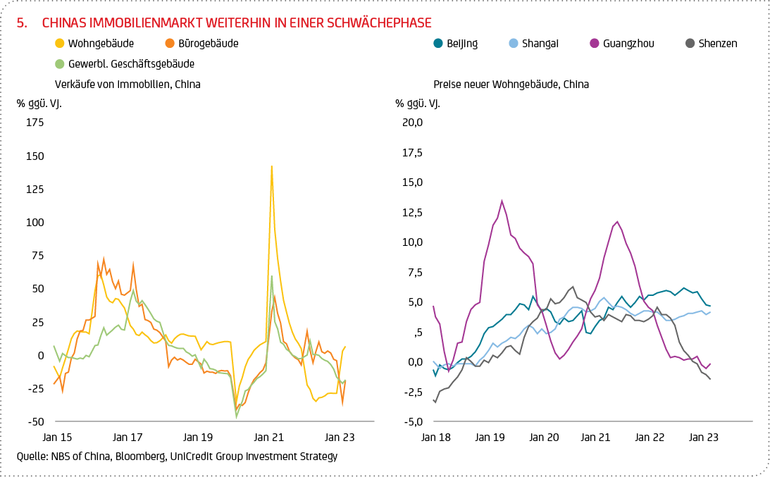 Das chinesische BIP-Wachstum hatte sich zum Jahresauftakt deutlich erholt (erstes Quartal: 2,2 % gegenüber Vorquartal, nach 0,6 % im vierten Quartal 2022). Auch wenn sich das Wachstum in diesem Jahr unserer Einschätzung nach rund 5 % betragen dürfte, gibt es doch einige Belastungsfaktoren, die es genauer zu beobachten gilt. Hier sticht der anfällige chinesische Immobiliensektor hervor. Insbesondere Immobilienverkäufe und -preise haben sich noch nicht wieder erholt (siehe Chart 5). Zwar sind die Verkäufe von Wohngebäuden im ersten Quartal 2023 wieder angestiegen, bei Büro- und gewerblichen Geschäftsgebäuden hingegen waren sie weiter rückläufig. Darüber hinaus deutet die Preisentwicklung bei neuen Wohngebäuden auf ein Ungleichgewicht von Angebot und Nachfrage hin. So haben sich etwa die Preise von Wohngebäuden in der größten Metropolregion Chinas, den Städten Guangzhou und Shenzhen, seit Beginn des Jahres nicht nur gegenüber dem Vorjahr weiter abgeschwächt, sondern sind sogar wieder gesunken. Die Regionen Beijing und Shanghai scheinen sich hingegen weitgehend stabilisiert zu haben, auch wenn die Preisentwicklung in Beijing zuletzt deutlicher nachgegeben hat. Diese Entwicklungen zeigen, dass sich der chinesische Immobilienmarkt weiter in einer schwierigen Situation befindet, die es zu beobachten gilt – und dass, obwohl die chinesische Regierung eine Reihe von Maßnahmen ergriffen hat, um den Markt zu stützen, angefangen bei Zinssenkungen für Wohnungsbaudarlehen bis hin zur Lockerung der Finanzierungsvorschriften für Bauunternehmen. Wir gehen nach wie vor davon aus, dass die staatlichen Maßnahmen greifen und das Wachstum Chinas in diesem Jahr stützen werden. Dennoch werden wir den chinesischen Immobiliensektor weiterhin genau beobachten, der für die Wachstumsaussichten des Landes von zentraler Bedeutung ist: Unter Einbeziehung verwandter Branchen macht er etwa knapp ein Drittel12 des Bruttoinlandsprodukts des Landes aus.