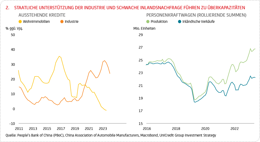 Ein Blick auf den Automobilsektor, der in den letzten Jahren von der großzügigen Regierungspolitik Chinas profitiert hat, kann Aufschluss darüber geben, wie sich nationale Ungleichgewichte global ausbreiten. Bereits 2001 wurde die Fokussierung auf Elektrofahrzeuge als prioritäres wissenschaftliches Forschungsprojekt in den chinesischen Fünfjahresplan aufgenommen. Von 2009 bis 2022 stellt die Regierung entsprechende Subventionen und Steuererleichterungen bereit. Grafik 2 zeigt die Kluft, die sich in der Post-Corona-Phase zwischen der Pkw-Produktion und dem inländischen Pkw-Absatz aufgetan hat. Dies ist sowohl auf die Ausweitung des Angebots über das Niveau vor der Pandemie als auch auf die schwache Nachfrage im Vergleich zum Zeitraum 2016-17 zurückzuführen.