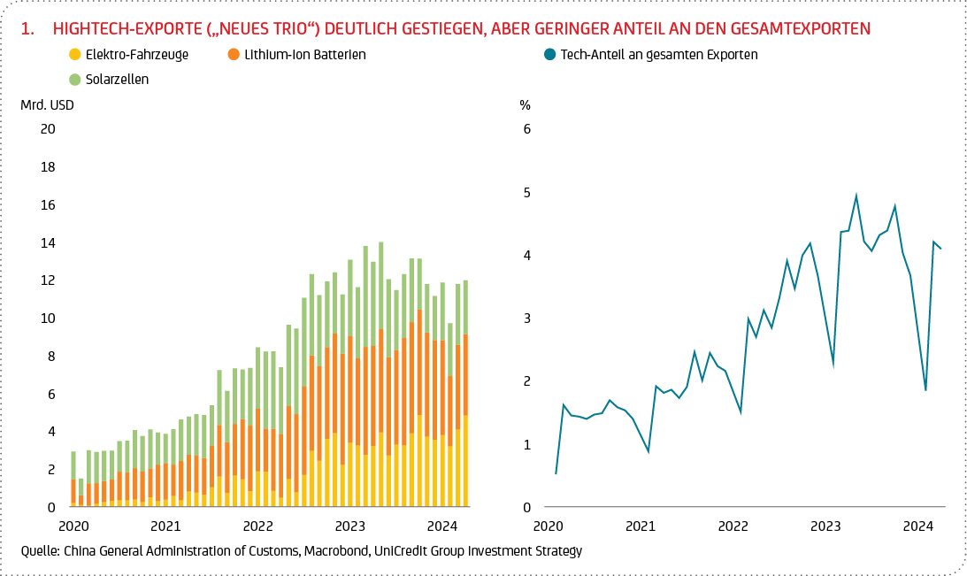 Das „neue Trio“ umfasst insbesondere solche Exporte, die die chinesische Regierung im Rahmen ihrer Wachstumsstrategie und der Fokussierung auf hochwertige Produktionsstufen vorantreiben möchte. Diese industrielle Vision ist eine Fortführung des früheren Plans „Made in China 2025“. Gerade über die letzten Jahre haben die Hightech-Exporte des „neuen Trios“ deutlich zugelegt (siehe Grafik 1). Trotz aller Rhetorik gehen wir davon aus, dass die Auswirkungen der Zölle auf die Hightech-Güter des „neuen Trios“ auf den chinesischen Handel sowie das Wachstum des Landes eher begrenzt sein werden. Unsere Ansicht nach haben die Zölle (bislang) in erster Linie einen symbolischen Charakter, da das Volumen der betroffenen Güter nur etwa 4 % der chinesischen Gesamtexporte ausmacht (basierend auf monatlichen Handelsdaten siehe Grafik 1) und die meisten der betroffenen Güter bereits Zöllen unterliegen.