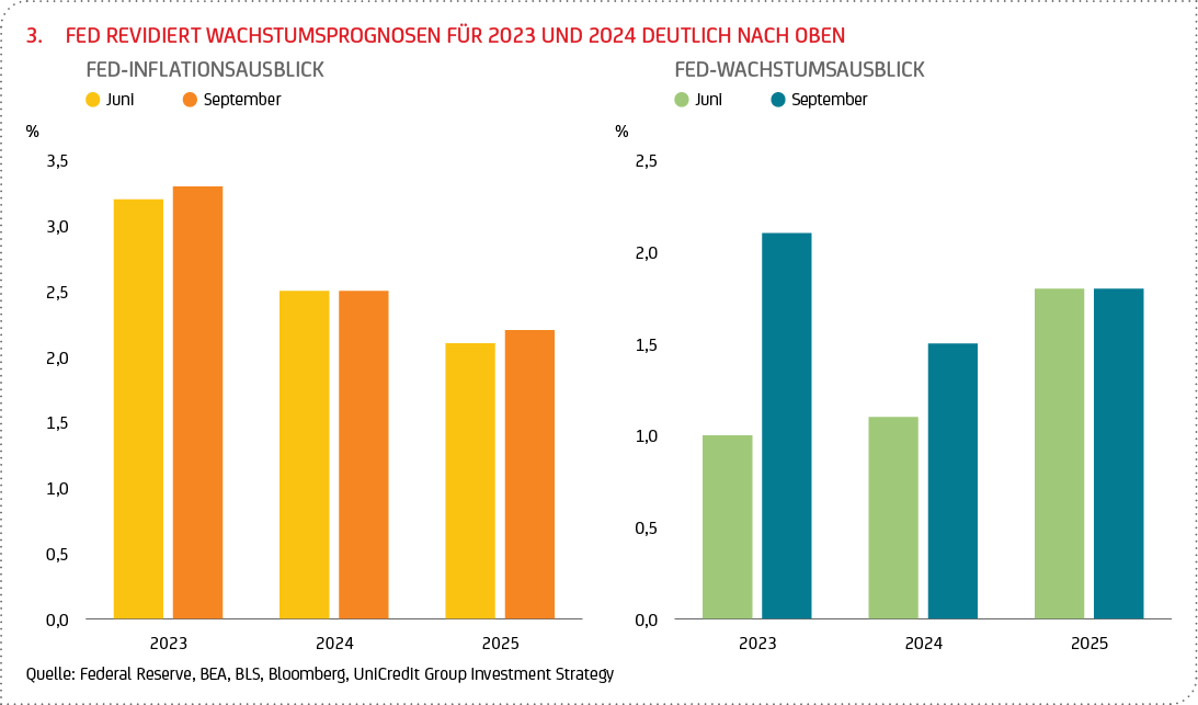 Der FOMC scheint zuversichtlicher zu sein, was die Aussicht auf ein „Soft Landing“9 (eine „weiche Landung“) der US-Wirtschaft angeht. So wurde das BIP-Wachstum für 2023 um 1,1 Prozentpunkte (Pp) auf 2,1 % und für 2024 um 0,4 Pp auf 1,5 % angehoben (siehe Grafik 3). Während die erste der beiden Aufwärtskorrekturen vor allem die bessere Datenlage in diesem Jahr widerspiegelt, war die Aufwärtskorrektur für das nächste Jahr eher eine Überraschung. Die Prognosen für die Arbeitslosenquote wurden ebenfalls nach unten korrigiert, und zwar auf 3,8 % in diesem Jahr (von 4,1 % im Juni) und 4,1 % im nächsten Jahr (von 4,5 %). Unserer Meinung nach ist dies zu optimistisch. In der Tat dürfte sich der Konsum in den kommenden Quartalen aufgrund abnehmender Sparpuffer (aus der Überschussersparnis), restriktiverer Kreditbedingungen (seitens der Banken) und eines nachlassenden Anstiegs bei den Löhnen verlangsamen. Ihre Inflationsprognose (PCE-Inflation10) für dieses Jahr hob die Fed ebenfalls an, wenn auch nur leicht auf 3,3 % (von zuvor 3,2 %), während die Prognosen für die Jahre 2024 und 2025 weitgehend unverändert blieben.