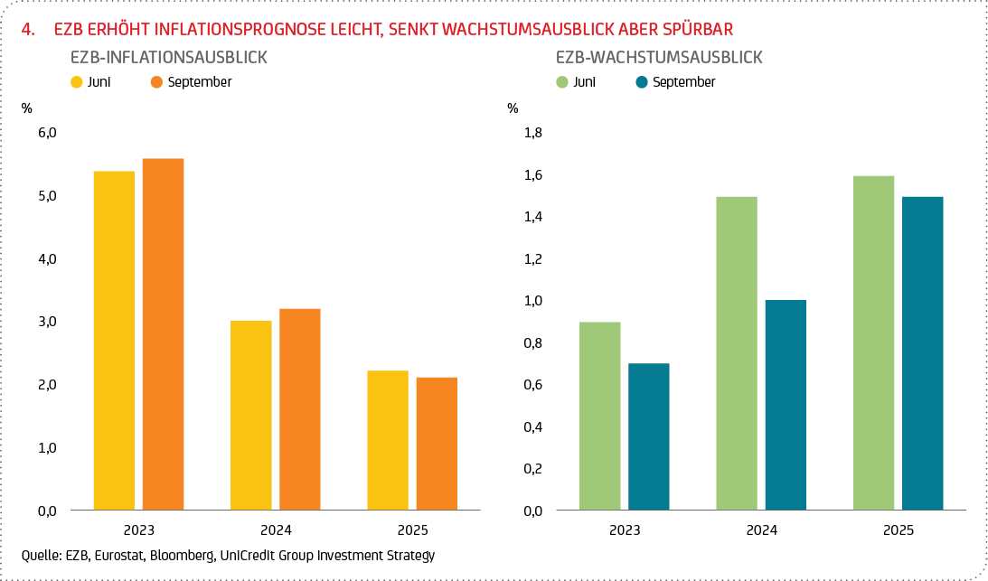 Neben dem Zinsentscheid hat die EZB auch neue Prognosen für die Inflation und das Wirtschaftswachstum im Euroraum veröffentlicht (siehe Grafik 4). Wie erwartet wurde die BIP-Prognose spürbar gesenkt, und zwar um insgesamt 0,8 Pp über den Dreijahreszeitraum (von 2023 bis 2025). Der größte Teil der Abwärtskorrektur entfällt dabei auf das zweite Halbjahr 2023, für das die EZB eine weitgehende Stagnation der Wirtschaft erwartet. Aufgrund von Übertragungen wirkt sich dies am stärksten auf den Durchschnittswert für 2024 aus (der von 1,5 % auf 1,0 % gesenkt wird). Dieser schwächere Wachstumspfad wird den Pfad für die Kerninflation um kumulativ 0,2 Pp absenken, wobei sich die Auswirkungen gleichmäßig auf die Jahre 2024 und 2025 verteilen. Die EZB-Prognose für die Gesamtinflation wurde für die nächsten Quartale aufgrund höherer Energiepreisannahmen nach oben korrigiert, während der Verlauf am Ende des Prognosehorizonts nun etwas schwächer ausfällt als im Juni (vorletzte Prognoseveröffentlichung), wobei die Inflationsrate im zweiten Halbjahr 2025 auf das Zielniveau von 2 % sinken dürfte. Insgesamt wurde die Inflationsprognose für 2025 von 2,2 % auf 2,1 % gesenkt, während sie für die Jahre 2023 und 2024 erhöht wurde – auf 5,6 % (von 5,4 %) und 3,2 % (von 3,0 %). Insgesamt lässt sich sagen, dass die EZB bei den Wachstumsaussichten im Euroraum eher Abwärtsrisiken sieht, während die Risiken für die Inflationsentwicklung eher unklar sind. Unserer Meinung nach dürfte die EZB – angesichts der wirtschaftlichen Schwäche des Euroraums – die Aufwärtsrisiken bei der Inflation wohl etwas zu hoch einschätzen. Aber selbst dann dürfte das Inflationsbild noch immer mit der Einschätzung der EZB nach länger anhaltend hohen Zinsen übereinstimmen.