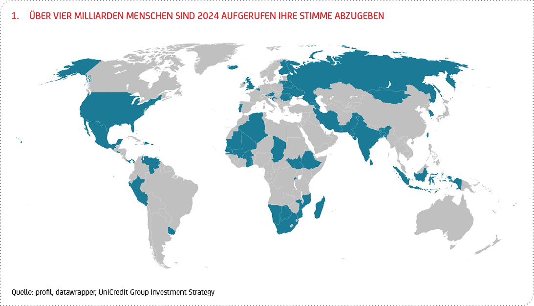 Nicht erst seit dem Angriffskrieg Russlands auf die Ukraine verfolgen Marktteilnehmer geopolitische Entwicklungen mit großer Aufmerksamkeit, und ein Blick auf die vergangenen Jahre zeigt, welche Auswirkungen sie auf die globalen Finanzmärkte haben können: Das Brexit-Referendum im Jahr 2016 oder die Wahl von Donald Trump zum US-Präsidenten ein Jahr später, aber auch die politische Reaktion auf die Corona-Pandemie sind Beispiele dafür, dass politische Entscheidungen nicht spurlos an den Märkten und Marktteilnehmern vorbeigehen. Mit gemischten Gefühlen blicken Letztere daher auf das Jahr 2024 – das Superwahljahr, in dem die Bürger in mehr als 70 Staaten, die laut Berechnungen des britischen Wirtschaftsmagazins Economist mit über vier Milliarden Menschen mehr als 50 % der Weltbevölkerung und einen großen Teil des globalen Bruttoinlandsprodukts (BIP) repräsentieren, aufgerufen sind, bei Präsidentschafts-, Parlaments- oder Kommunalwahlen ihre Stimme abzugeben. Wir geben einen Überblick über die bedeutendsten Wahlen des Jahres 2024 und nehmen auch mit Blick auf die Frage möglicher Implikationen für die Investmentstrategie eine kurze Einordnung vor. Nicht alle werden für die globalen Finanzmärkte von Bedeutung sein, da sie in Ländern mit zu geringem wirtschaftlichem oder geopolitischem Einfluss stattfinden, als dass sie an den Märkten Beachtung finden würden. Der Fokus der globalen Finanzmärkte liegt zweifelsohne auf der US-Präsidentschaftswahl im November.