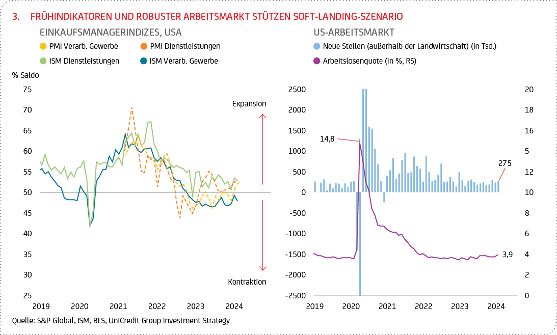 Die jüngsten Konjunkturdaten deuten auf ein stabiles Wachstum der US-Wirtschaft im ersten Quartal 2024 hin. Frühindikatoren wie der der Einkaufsmanagerindex für den Dienstleistungssektor, der vom Institute of Supply Mangement (ISM) ermittelt wird, befinden sich weiterhin im Expansionsbereich, während der ISM-Index für die Industrie zwar noch unter der Marke von 50 (Kontraktion) liegt, sich aber seit einigen Monaten tendenziell verbessert (siehe Grafik 3). Der für die US-Wirtschaft so wichtige Arbeitsmarkt zeigte sich nach den soliden Januarzahlen (nach Revisionen) auch im Februar robust. Allerdings stieg die Arbeitslosenquote mehr als erwartet an (siehe Grafik 3). Letzteres steht im Einklang mit den Ergebnissen anderer Arbeitsmarktindikatoren, die darauf hindeuten, dass die Lage auf dem Arbeitsmarkt deutlich weniger angespannt ist und sich in den kommenden Monaten weiter entspannen wird. Trotz der zu erwartenden Verlangsamung der konjunkturellen Dynamik bis zur Jahresmitte und dem Szenario eines Soft Landing9 der US-Wirtschaft rechnen wir für 2024 mit einer gesamtwirtschaftlichen Wachstumsrate von rund 2 %.