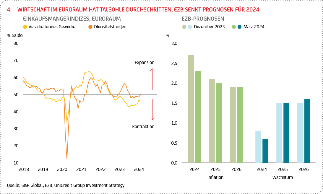 Wie erwartet hat die EZB ihre Geldpolitik im März unverändert gelassen. Die Zentralbank hat ihre Inflationsprognosen sowohl für die Gesamt- als auch für die Kerninflation weiter nach unten revidiert und damit einen wichtigen Schritt in Richtung Zinssenkungen getan (siehe Grafik 4). EZB-Präsidentin Christine Lagarde bekräftigte, dass der geldpolitische Rat der EZB mehr Daten, insbesondere zu den Löhnen, benötige, um Zuversicht mit Blick auf die Nachhaltigkeit des Disinflationsprozesses zu gewinnen. Sie verwies ausdrücklich auf die Juni-Sitzung, bei der die meisten dieser Informationen vorliegen werden. Wir halten daher Juni weiterhin für den wahrscheinlichsten Zeitpunkt für eine erste Zinssenkung, gefolgt von einer schrittweisen Senkung um 25 Basispunkte pro Quartal. Während der Zinssenkungszyklus von den Daten abhängen wird, deutete die EZB-Präsidentin an, dass „die restriktive Phase der EZB noch eine Weile andauern wird“, gefolgt von einer „Phase der Normalisierung“. Auch wenn es schwierig ist, diese Aussagen genau zu interpretieren, drängt sich der Eindruck auf, dass die EZB ein langsameres Tempo bei den Zinssenkungen anstrebt. Dafür sprechen mehrere Faktoren: die Widerstandsfähigkeit des Arbeitsmarktes, die das Risiko einer harten Landung der Wirtschaft verringert und die hohe Unsicherheit über die Höhe des neutralen Leitzinses, der die Wirtschaft im Euroraum im Gleichgewicht hält. Dafür spricht auch, dass die EZB die Zinsen zu einem Zeitpunkt senken dürfte, zu dem die Wirtschaft wieder anziehen sollte.