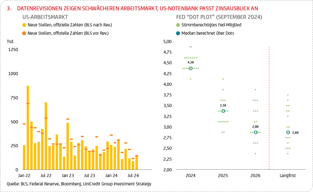Auf ihrer Sitzung im September leitete die US-Notenbank (Fed) erwartungsgemäß ihren Zinssenkungszyklus ein. Die Zinssenkung um 50 Basispunkte (Bp) auf 5,00 % ein (Leitzins am oberen Band) war ein größerer Schritt als von den meisten Ökonomen erwartet, obwohl die Finanzmärkte bereits im Vorfeld der Sitzung eine Zinssenkung in dieser Größenordnung von 50 Bp eingepreist hatten. Laut dem Vorsitzenden der Fed, Jerome Powell, machen die Fortschritte bei der Disinflation11 und die Abkühlung am Arbeitsmarkt eine Neuausrichtung der Geldpolitik notwendig. Die US-Wirtschaft befindet sich nach Einschätzung der Notenbank grundsätzlich in einer guten Verfassung und die Zinssenkung dient dazu, die Wirtschaft in dieser zu halten. Dies spiegelt sich auch in den aktualisierten Wachstumsprognosen der Fed für dieses Jahr und die folgenden drei Jahre wider, die weiterhin von einem soliden Wachstum von 2 % ausgehen. Die Inflationsprognosen wurden weiter nach unten korrigiert und unterstreichen, dass sich die Fed auf dem Weg in Richtung der Zielmarke von 2 % sieht. Der aktualisierte „Dot Plot12“ zeigt einen eher graduellen Zinssenkungszyklus (siehe Grafik 3), wobei der geldpolitische Ausschuss grob zwischen kumulativen Zinssenkungen von 25 und 50 Bp in den verbleibenden zwei Sitzungen dieses Jahres und einer mittleren Projektion von 100 Bp für das nächste Jahr schwankt. Powell betonte auf der Pressekonferenz jedoch, dass alle Optionen weiter offen seien und das tatsächliche Ausmaß und Tempo der Zinssenkungen von der Gesamtheit der eingehenden wirtschaftlichen Daten abhängen werde. Wir gehen davon aus, dass die Fed die Zinsen bis zum Jahresende um weitere 50 Bp senken wird.