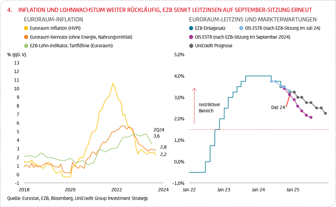 Auf ihrer Sitzung im September senkte die EZB erwartungsgemäß den Einlagensatz um 25 Bp auf 3,50 % (siehe Grafik 4). Der Refinanzierungssatz wurde von 4,25 % auf 3,65 % gesenkt, was die für September angekündigte Verringerung des Abstands zwischen den beiden Leitzinsen auf 15 Bp widerspiegelt. Neben dem Zinsentscheid legte die Zentralbank auch revidierte Wachstums- und Inflationsprognosen vor. Die neue Prognose für die Gesamtinflation blieb im Vergleich zum Juni unverändert, während die Prognose für die Kerninflation leicht angehoben wurde. Trotz dieser Ankündigung geht die EZB weiterhin davon aus, dass sich sowohl die Kern- als auch die Gesamtinflation bis Ende 2025 in Richtung 2 % bewegen werden. Für die einzelnen Jahre des Prognosezeitraums (2024 bis 2026) hat die Notenbank ihre Wachstumsprognosen leicht nach unten korrigiert, vor allem wegen der schwachen Entwicklung des privaten Konsums. Dennoch geht die EZB nicht von einer Rezession aus und hält an ihrem insgesamt konstruktiven Konjunkturausblick für die kommenden Jahre fest. In der Pressekonferenz hielt sich EZB-Präsidentin Lagarde hinsichtlich des Zeitpunkts und der Höhe des nächsten Zinsschritts bedeckt. Ein Indiz dafür, dass die Notenbank bei ihrer nächsten Sitzung im Oktober wohl eine Zinspause einlegen wird, ist jedoch die Aussage, dass zwischen dem jetzigen Zeitpunkt und der Sitzung eine „relativ kurze Zeitspanne“ liege. Daraus lässt sich schließen, dass die EZB bis dahin nicht über genügend Informationen verfügen wird, um einen weiteren Schritt zu unternehmen. Wir bleiben daher bei unserer Erwartung, dass die EZB die Zinsen in diesem Jahr noch einmal senken wird, und zwar um 25 Bp, auf der Sitzung im Dezember.